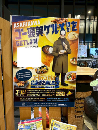 ゴールデンカムイと北海道を楽しもう!のイベントでは、旭川エリアは鶴見中尉になりますので、ここには鶴見中尉のポスターがある・・・と記載があったはずなのですが、見つけられず。チラシのみGETできました。