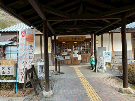 左にまがると売店。まっすぐ行くと黄金の湯の入口です。